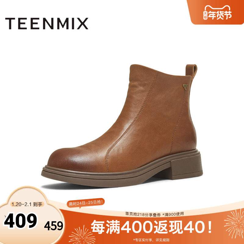 天美意厚底英伦奶皮靴加绒切尔西短靴女鞋子时装靴皮靴2025冬新款