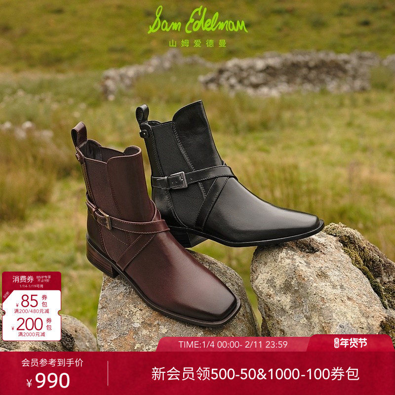 SAM EDELMAN山姆爱德曼冬新皮带扣方头粗跟切尔西短靴女TANNER