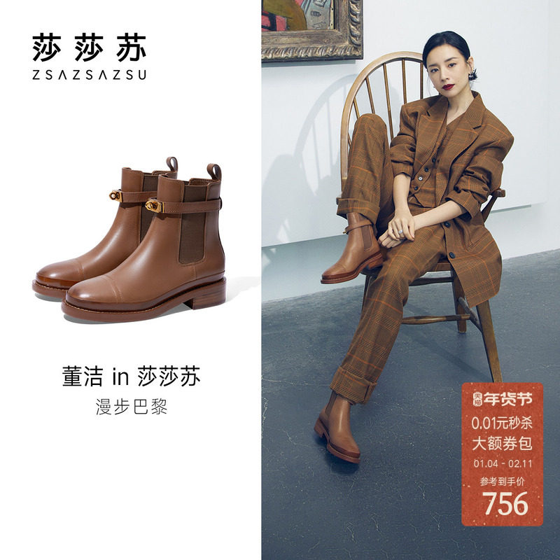 [明星同款]莎莎苏秋冬款复古厚底加绒保暖切尔西短靴女棕色瘦瘦靴