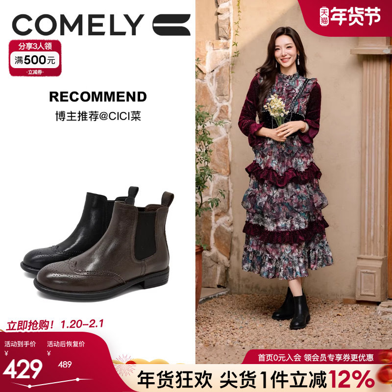 康莉时装周同款美拉德切尔西短靴女25冬新款牛皮复古雕花加绒靴子