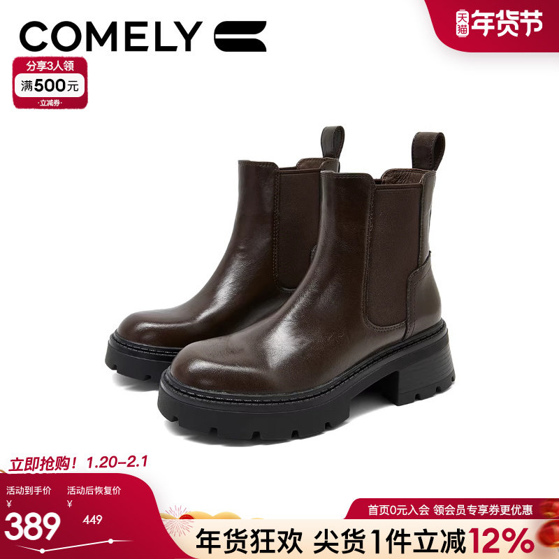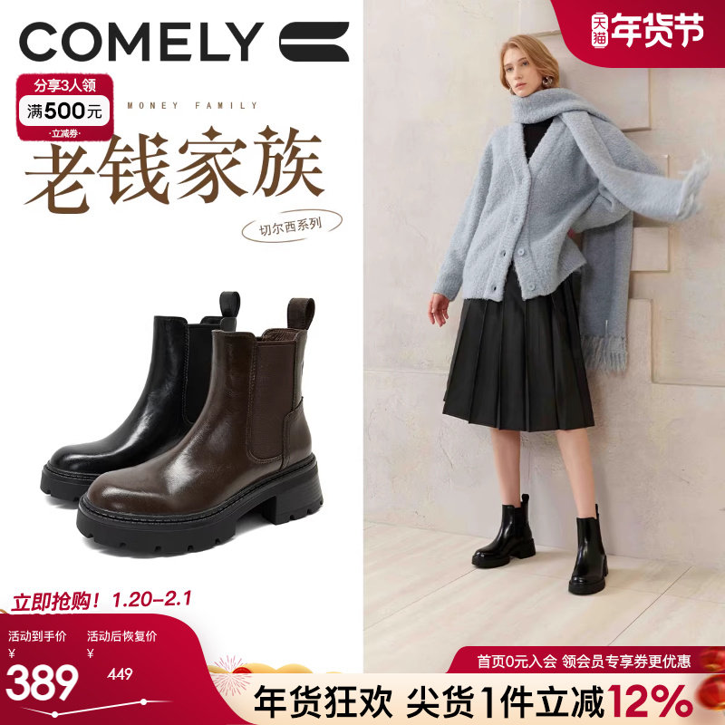天美意复古厚底英伦奶皮靴切尔西短靴女鞋子时装靴皮靴2025冬新款