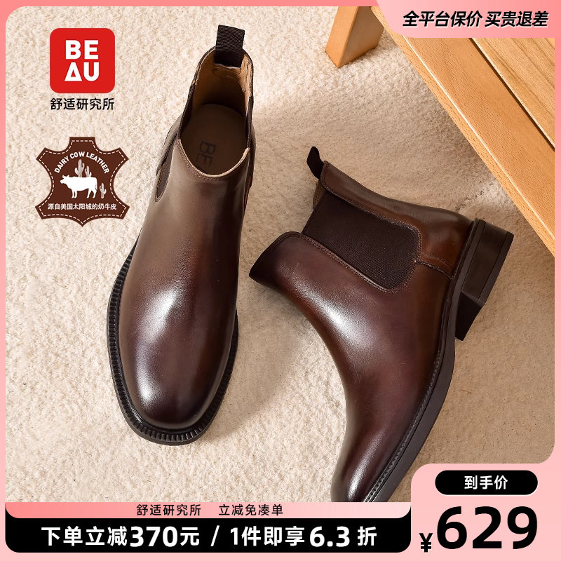 BEAU英伦风切尔西短靴女春秋真皮烟筒马丁靴瘦瘦靴加绒棕色切尔西