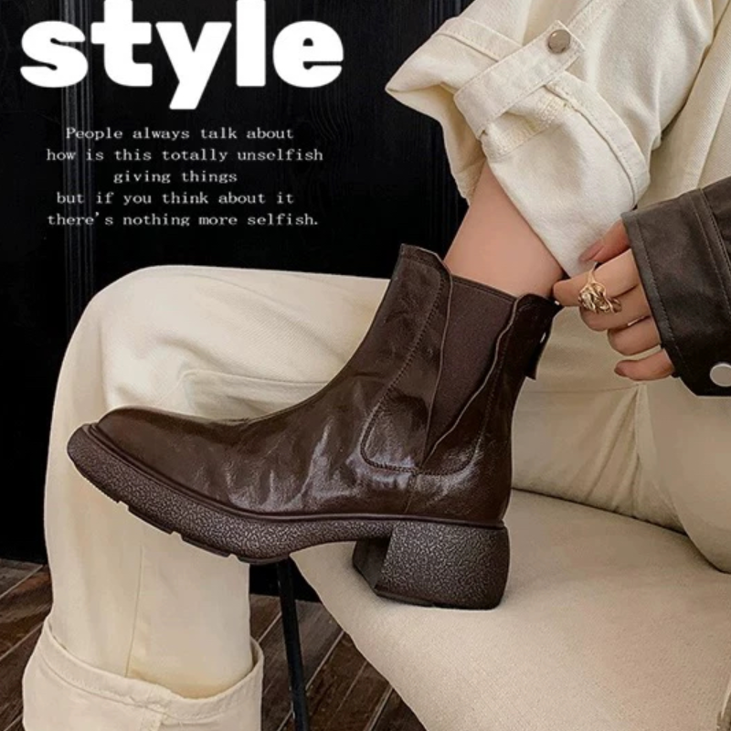 fed复古真皮粗跟显瘦切尔西短靴女秋冬新款后拉链圆头高跟马丁靴