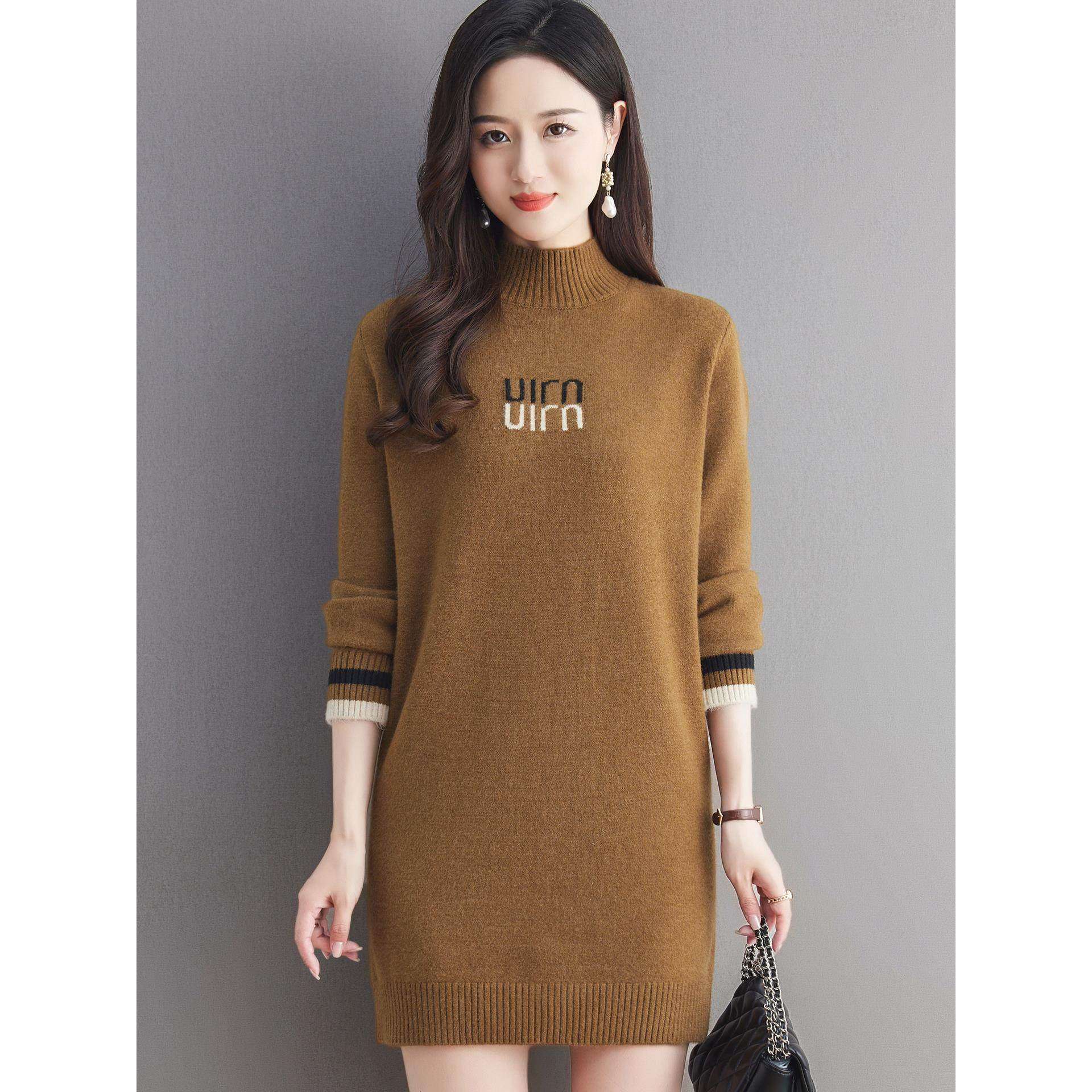 秋冬新款半高领中长款毛衣裙宽松休闲加厚内搭时尚打底羊毛针织裙