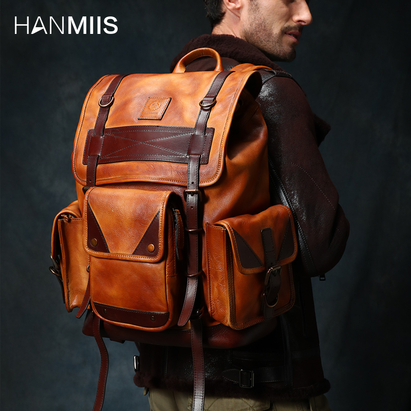 HANMIIS小怪兽头层牛皮大容量植鞣双肩包旅行袋包全真皮男士背包