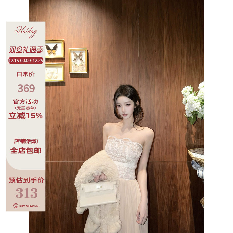 Hotdog 热狗很辣【香氛美人】白色蕾丝边百褶抹胸内搭外穿连衣裙