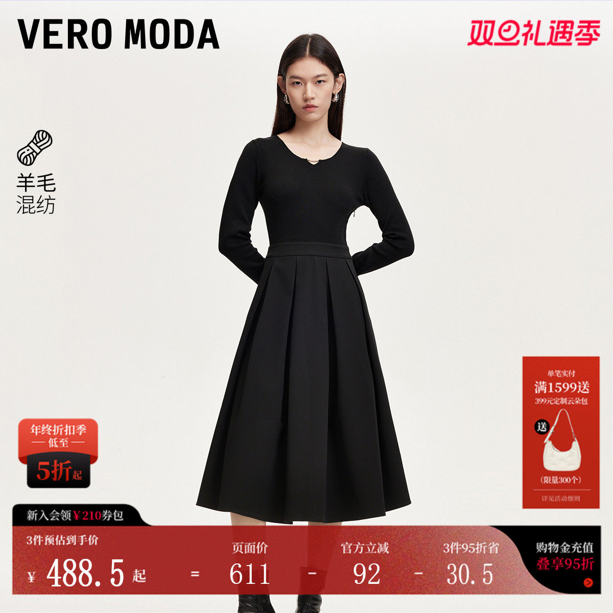 Vero Moda连衣裙秋冬针织拼接百褶裙赫本小黑裙优雅气质324346030