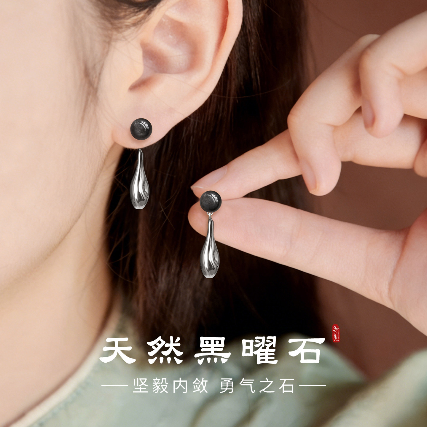黑色两戴耳饰高级感旺财玄学流苏耳坠s999纯银黑曜石耳钉水滴耳环