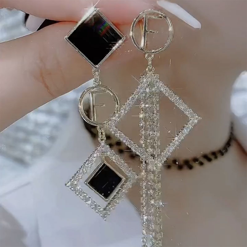 独特设计几何菱形流苏气质耳环2026新款黑色水晶时尚百搭耳扣耳饰