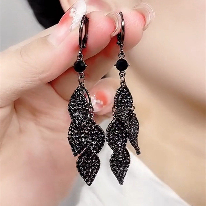 小众设计感黑色满钻树叶流苏耳环百搭耳扣气质长款显脸瘦夸张耳饰