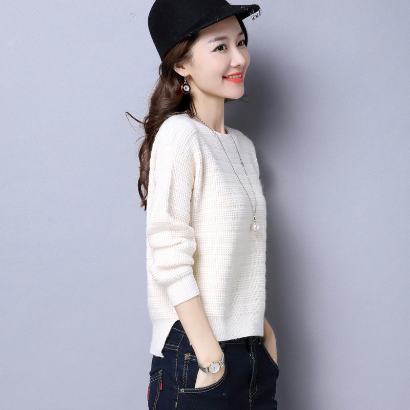 春秋薄款套头圆领毛衣女长袖宽松百搭韩版针织打底衫短款上衣大码
