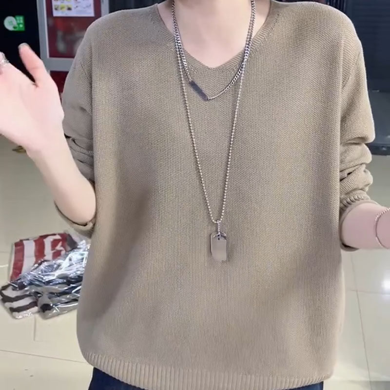 大码女装韩版遮肚子显瘦短款针织上衣女宽松V领长袖套头百搭毛衣