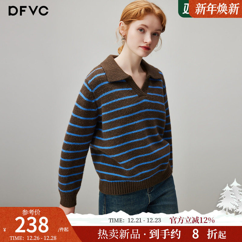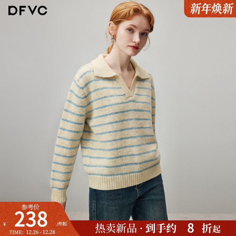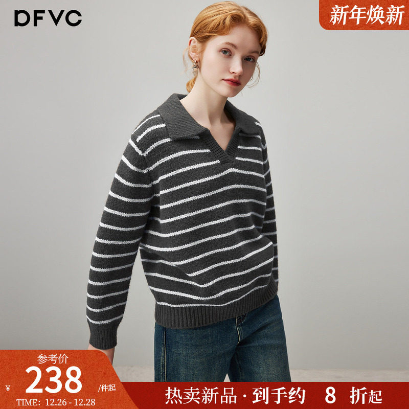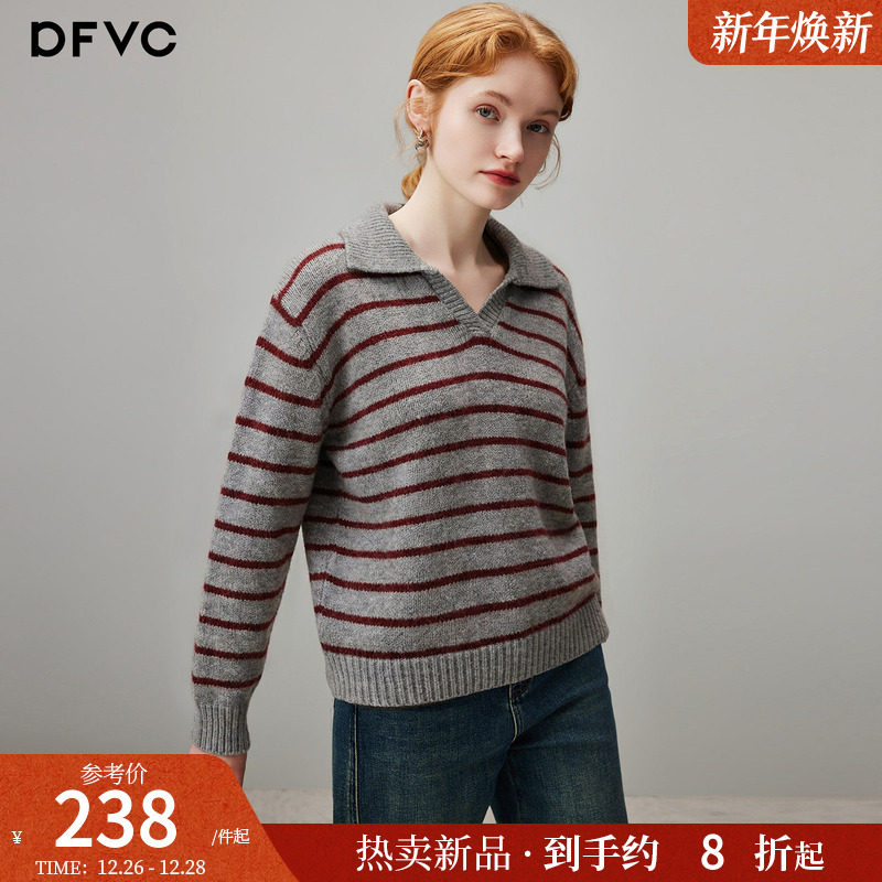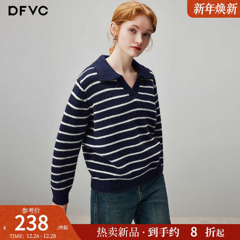 dfvc韩版POLO领条纹毛衣女2025年冬季新款短款宽松套头百搭针织衫