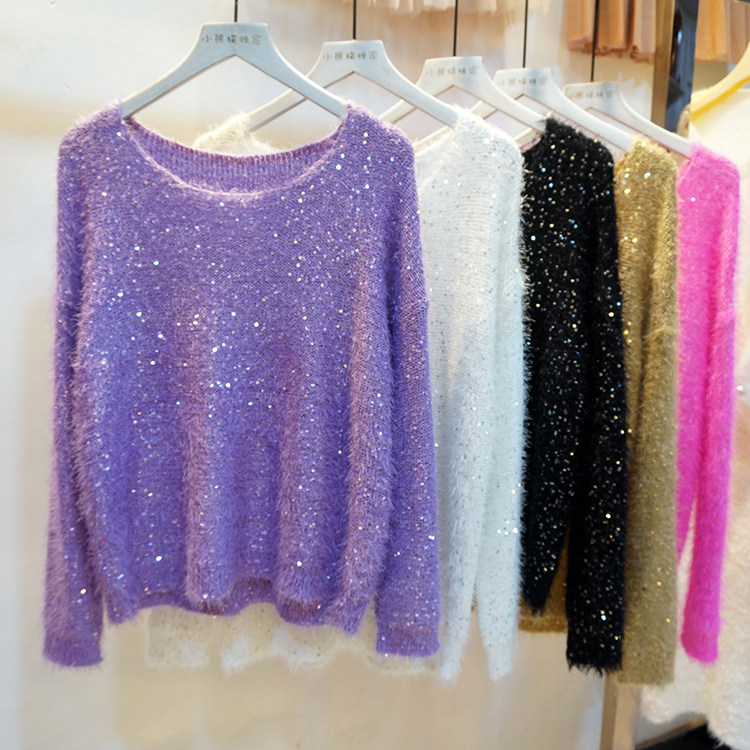 春秋新款韩版亮闪闪马海毛针织衫女套头圆领短款宽松百搭打底毛衣