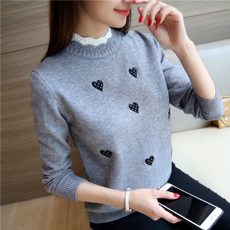 爱心毛衣韩版秋冬季新款套头刺绣宽松百搭针织打底衫女短款假两件