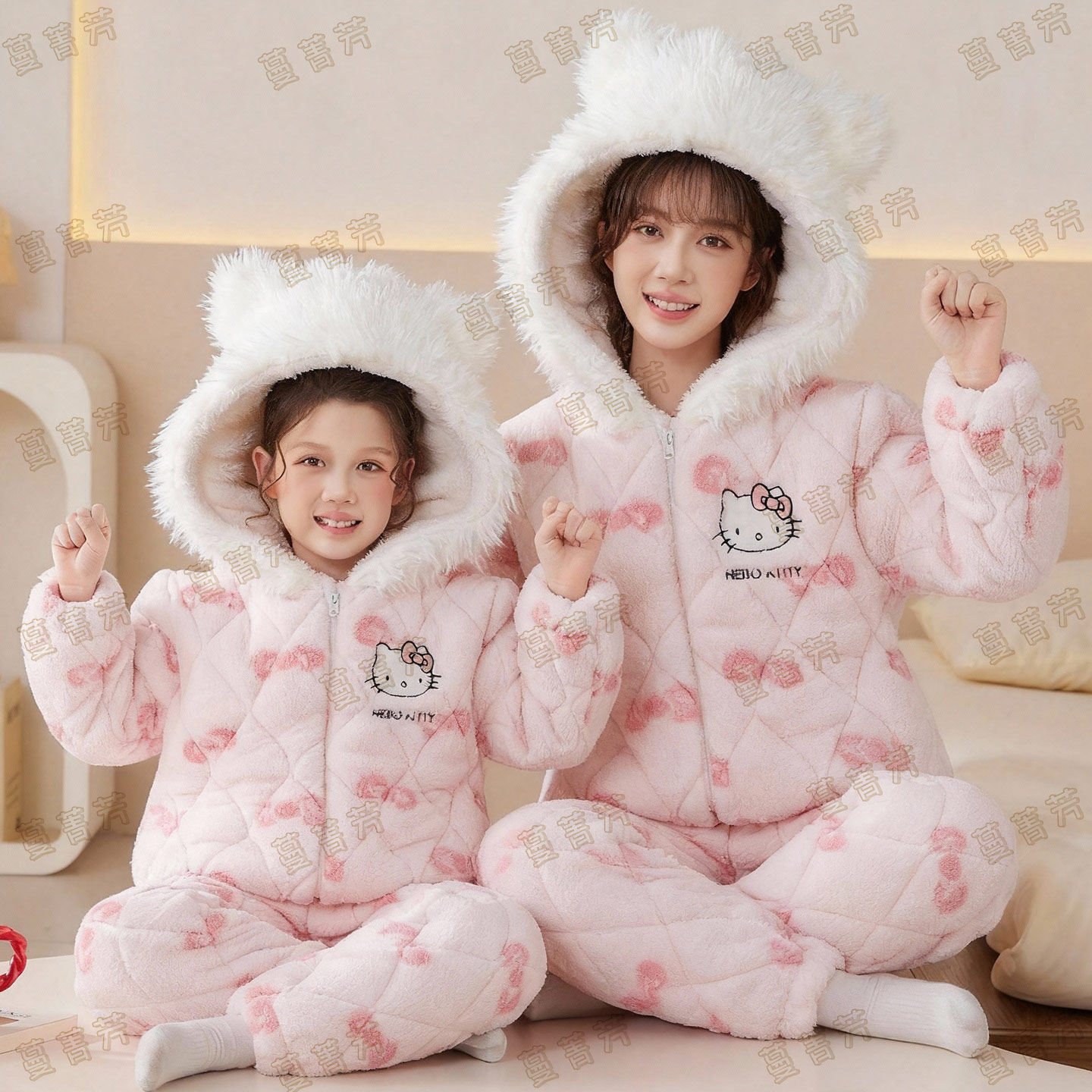 母女亲子装睡衣儿童女孩冬季加绒加厚款凯蒂猫女童三层夹棉家居服