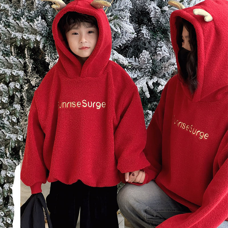 巴布豆母女亲子装新年款冬2026新款儿童一体绒红色卫衣全家福洋气