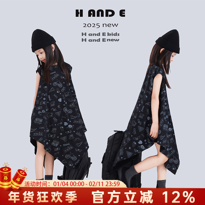 H AND E 原创童装2025夏季不规则黑色卡通印花连衣裙母女亲子装