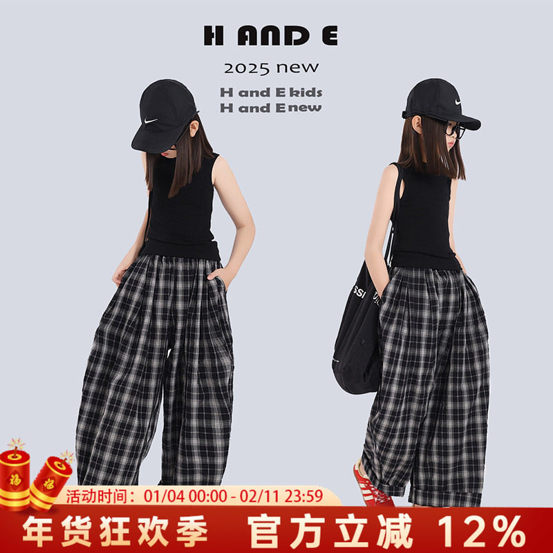 H AND E 原创童装2025夏季黑色休闲阔腿格子裤女童母女亲子装