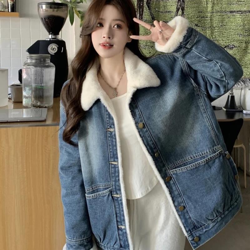 欧货加绒牛仔外套女2023秋冬新款港风短款上衣羊羔毛内里派克服潮