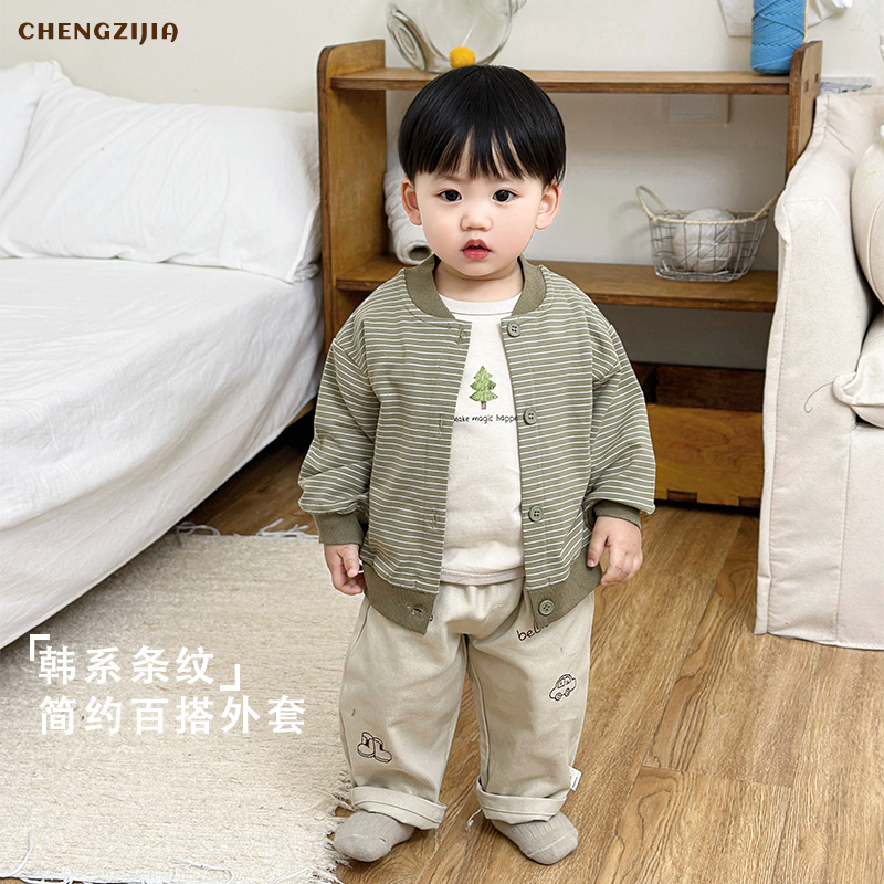 韩版婴儿春秋套装条纹休闲外套男童圆领印花打底衫女宝宝卡通裤子