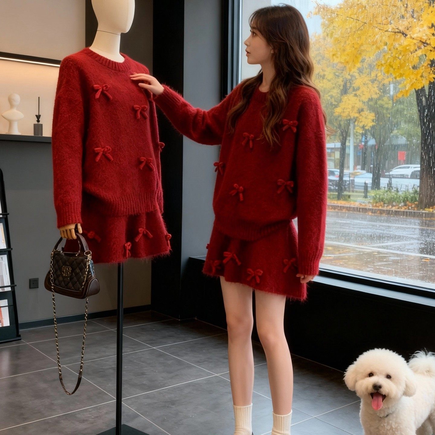 温柔风红色蝴蝶结宽松针织套装女2025秋冬显瘦流行宽松毛衣两件套
