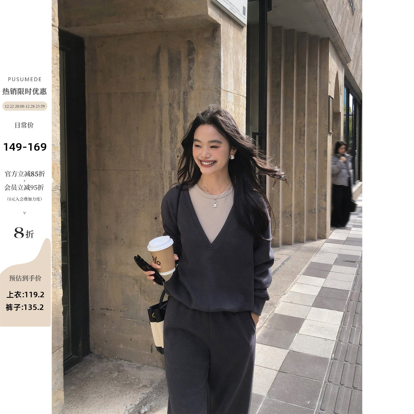 pusumede 暖糯漫邮 松弛感V领长袖针织衫女宽松休闲针织卫裤套装