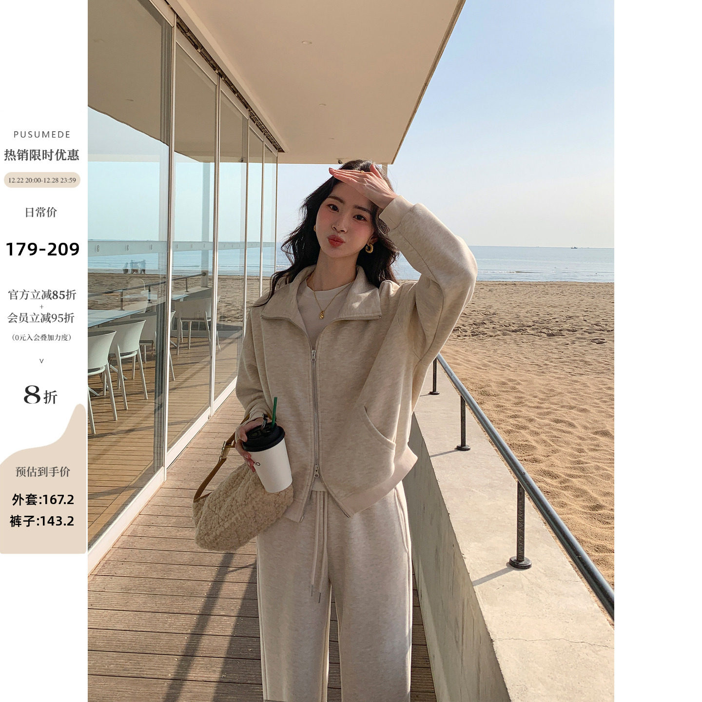 pusumede 松弛主义 立领卫衣外套女宽松拉链针织开衫+休闲裤套装