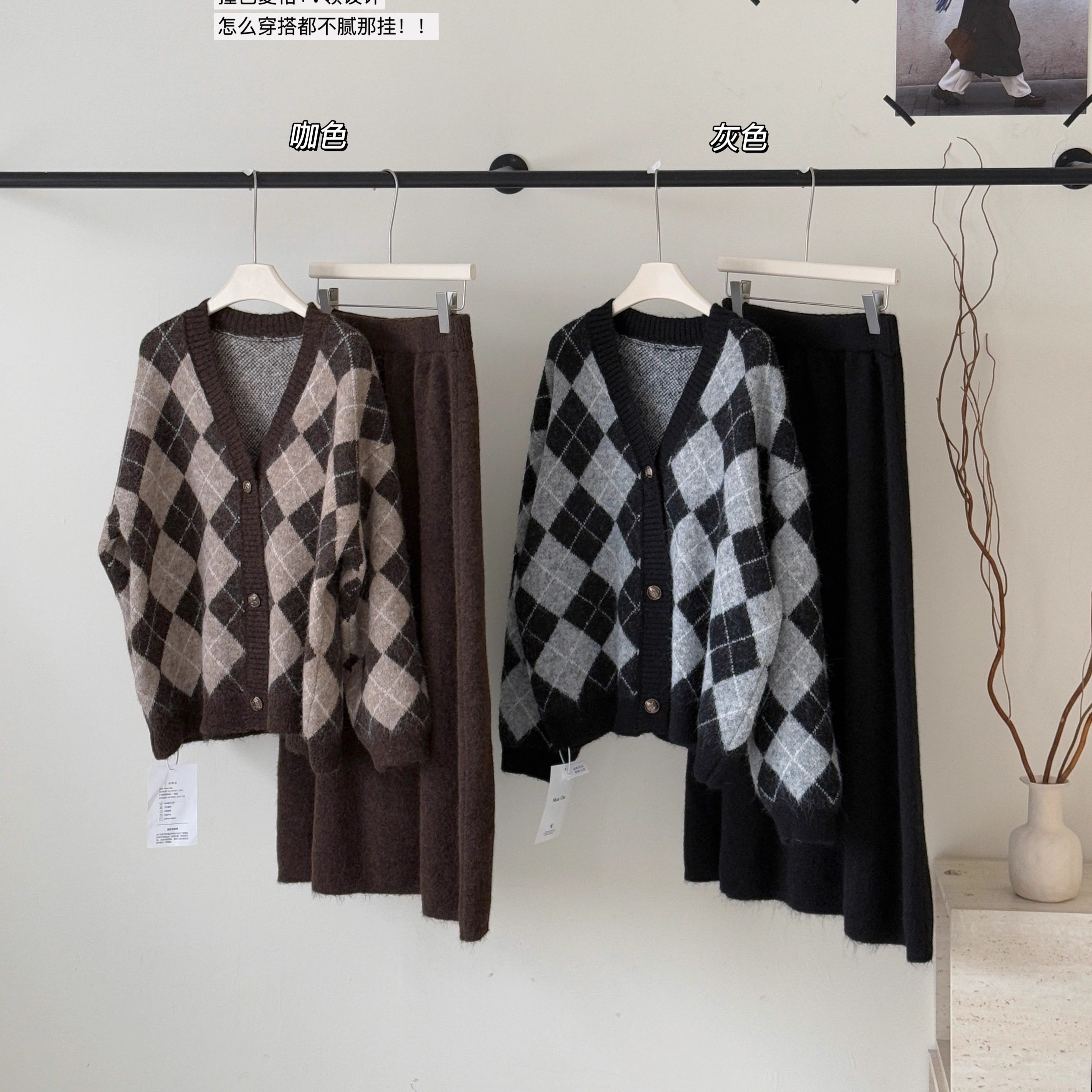 韩系慵懒菱格V领毛衣开衫+半身裙两件套女秋冬高级感宽松针织套装