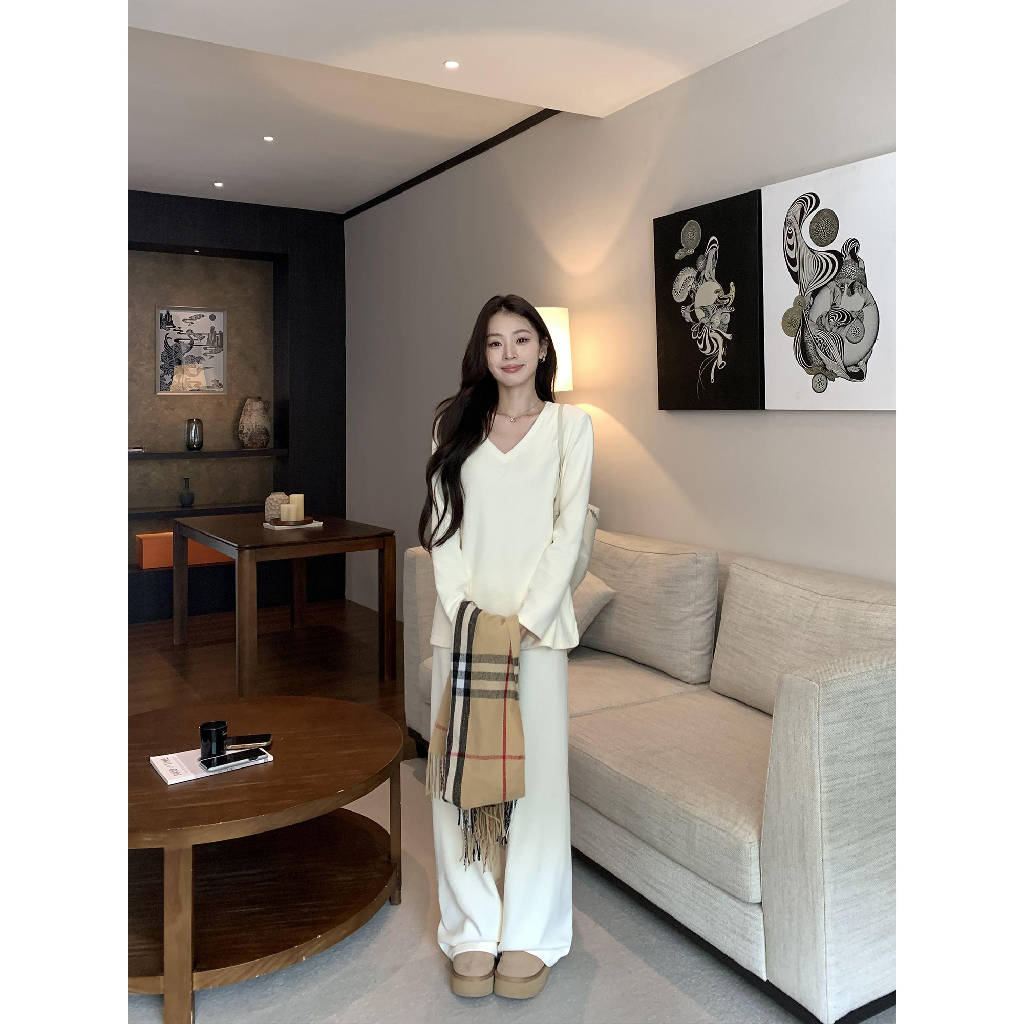 MULVAN 白色V领毛衣女宽松慵懒oversize针织衫上衣阔腿休闲裤套装