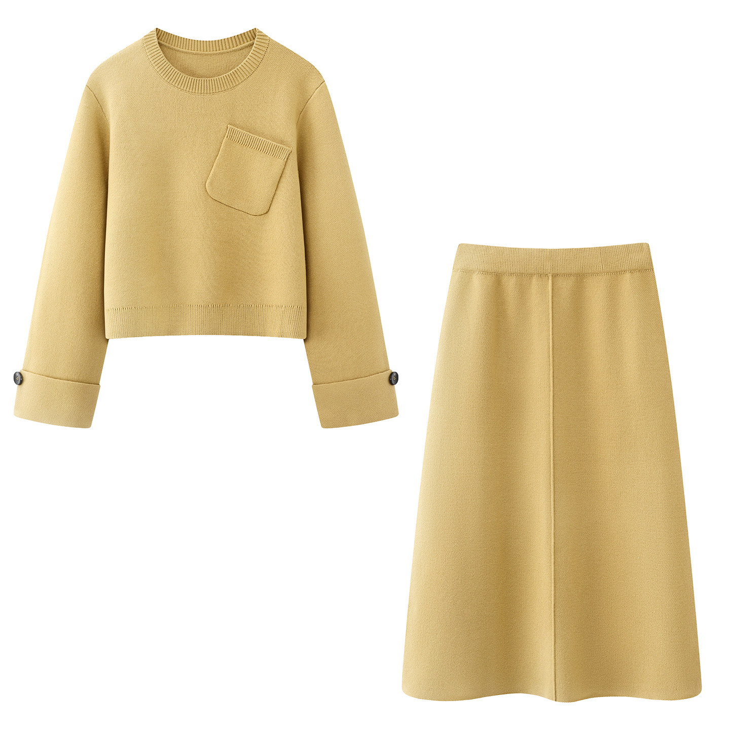 阔 黄色休闲宽松针织套装女长袖上衣半身裙两件套2025秋冬新款