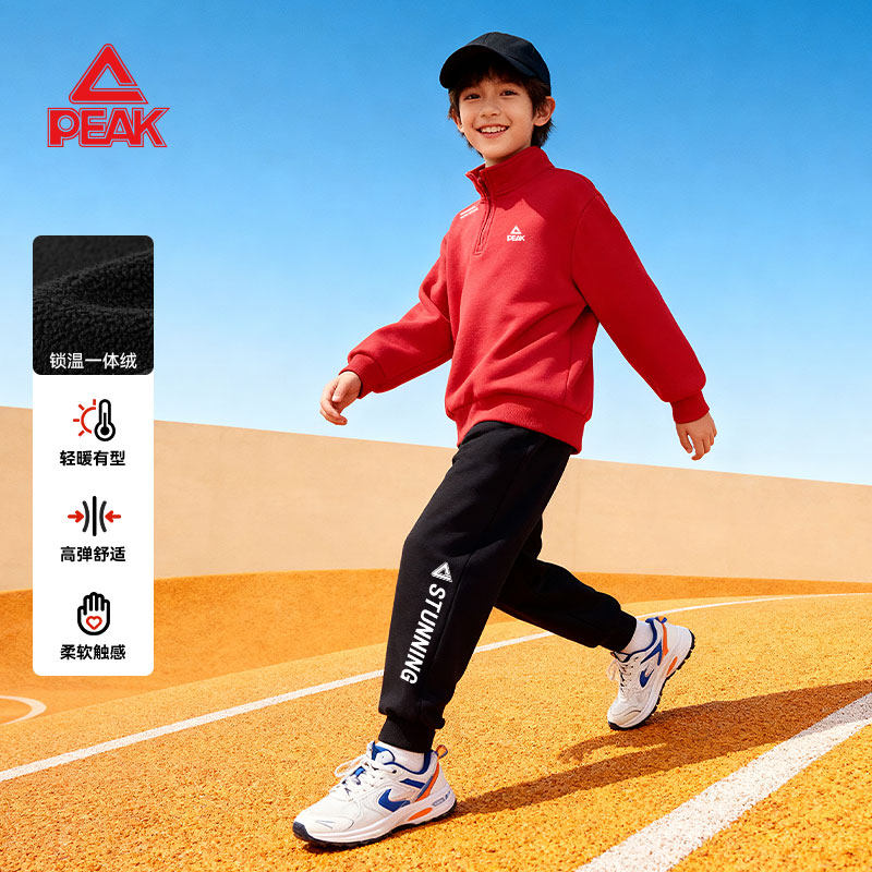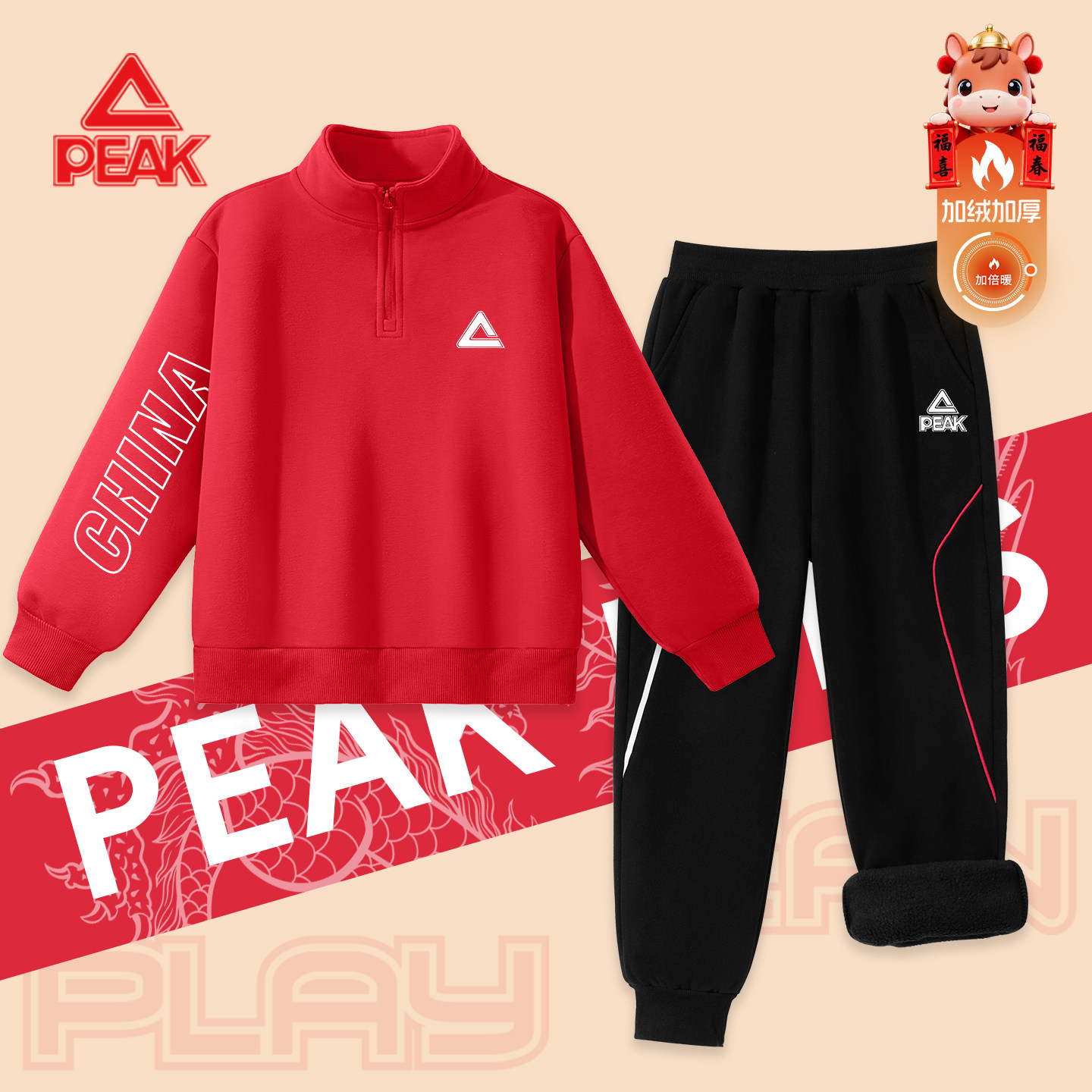 匹克童装男童运动套装冬装儿童训练服保暖加厚红色青少年卫衣加绒