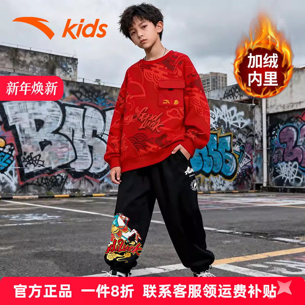 安踏童装男童运动套装冬季加绒保暖2026马年新年红色儿童卫衣长裤