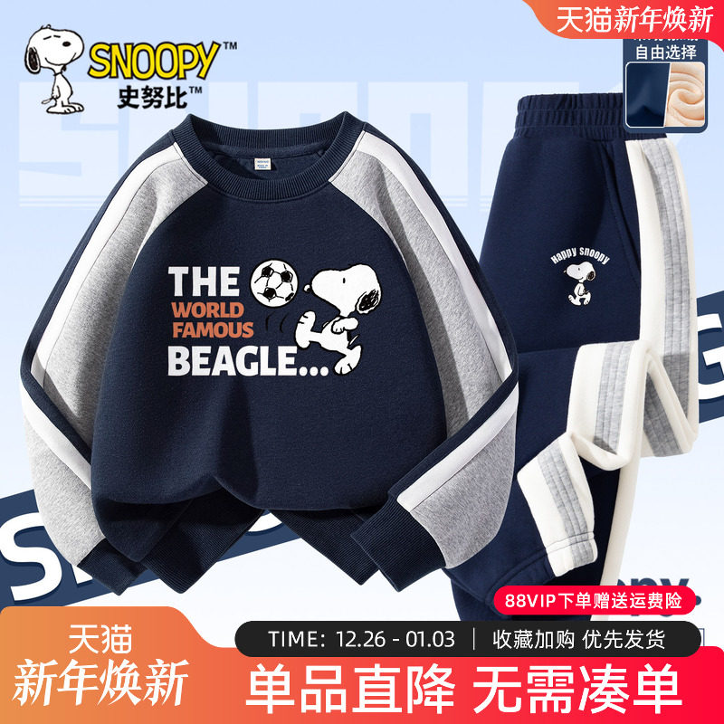 史努比童装男童运动套装加绒2025新款男孩卫衣秋冬款儿童帅气秋装