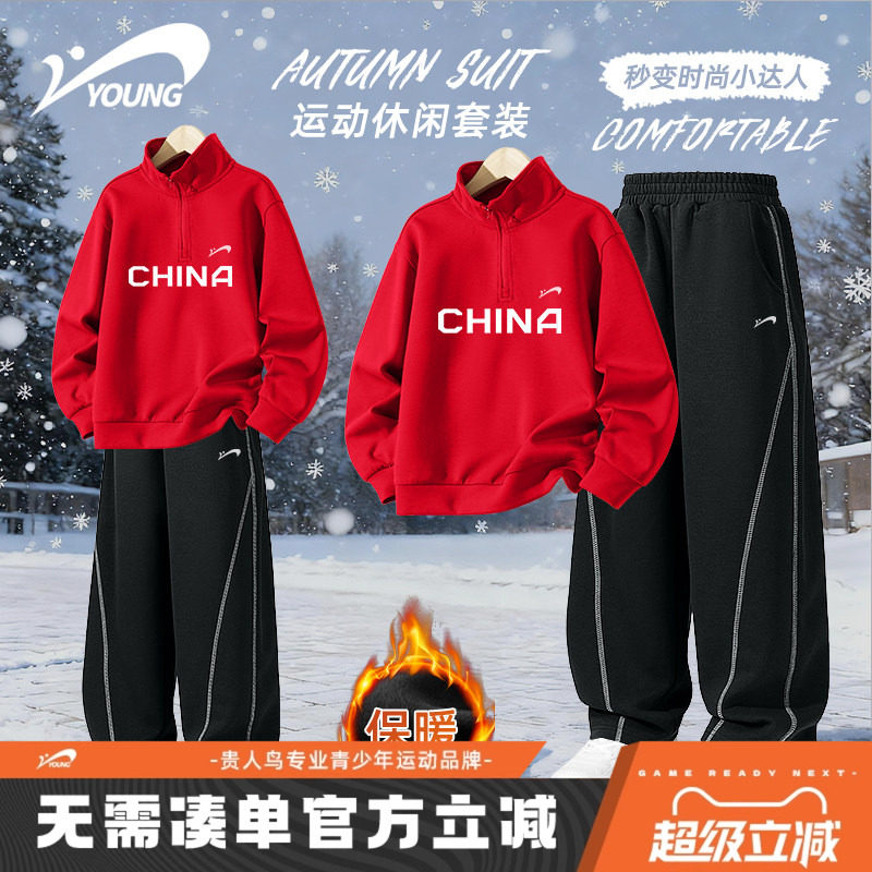 贵人鸟童装男童运动套装红色秋冬装儿童衣服大童卫衣加绒两件套厚