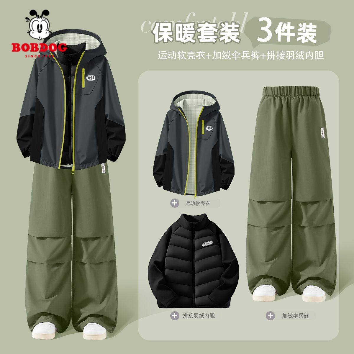 巴布豆男童运动套装冬2025新款户外加绒男孩冲锋外套防寒儿童长裤