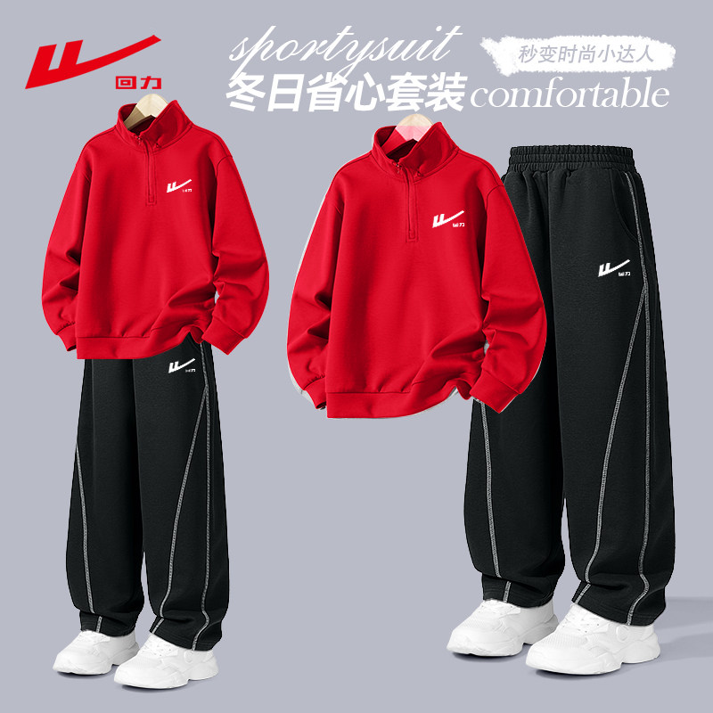 匹克童装男童运动套装2026新款大童本命年12岁红色卫衣服加绒冬装