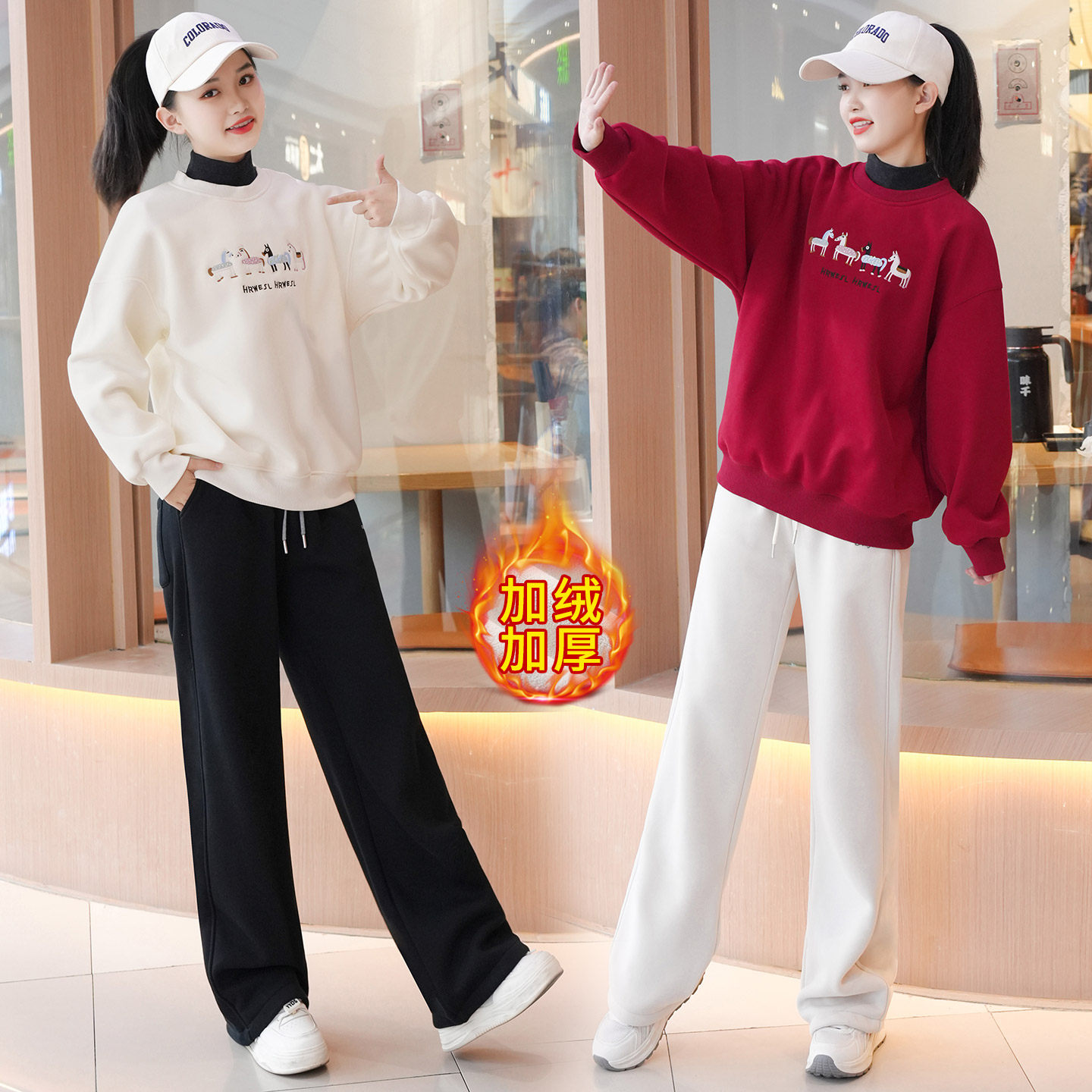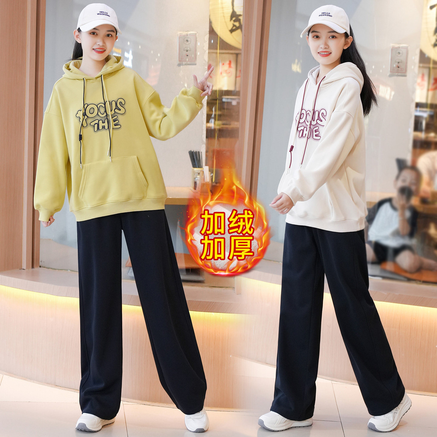 女大童加绒套装2025新款青少年8-18岁女孩学生保暖卫衣休闲裤套装