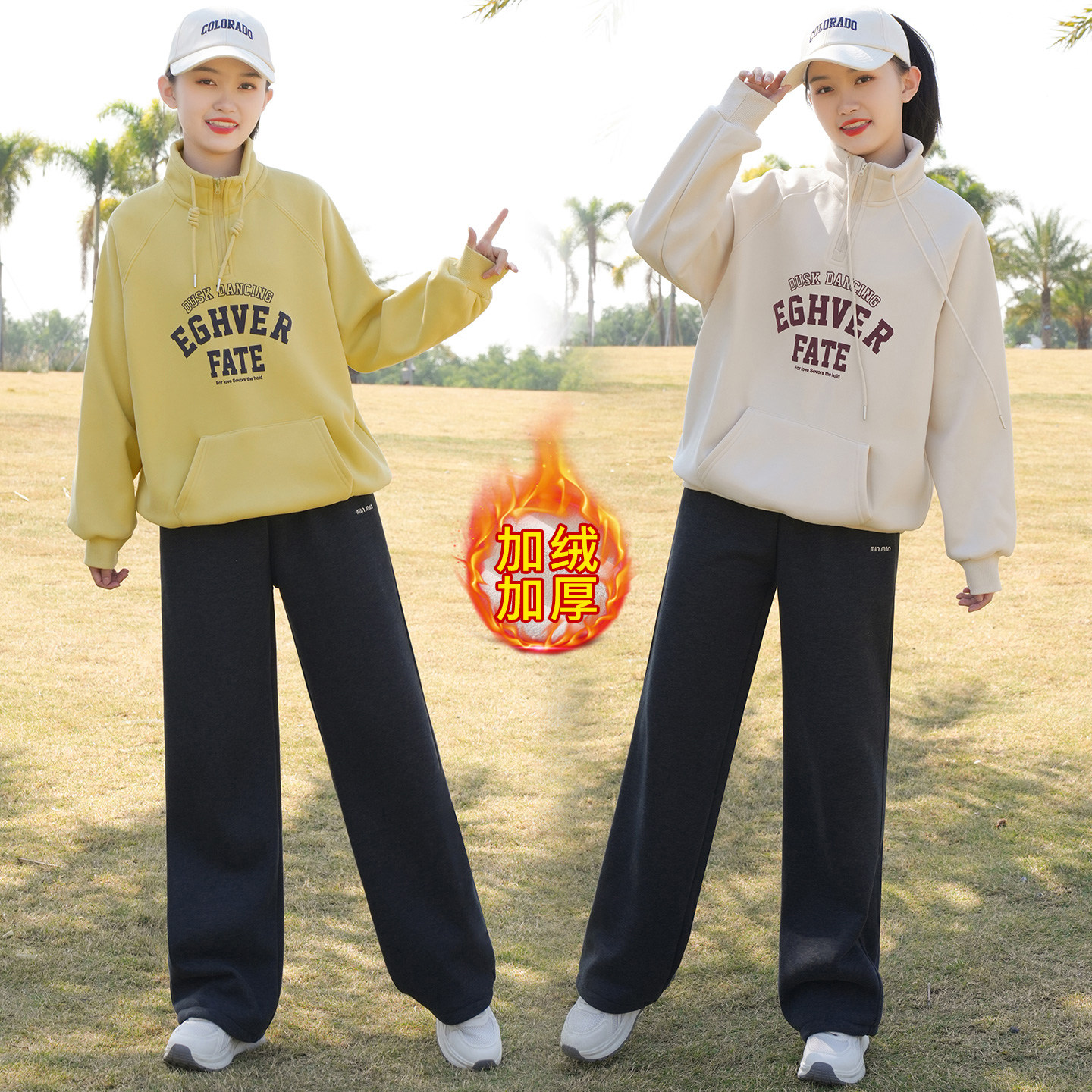 女大童冬季加绒套装2025青少年学生女孩加绒立领卫衣保暖长裤套装
