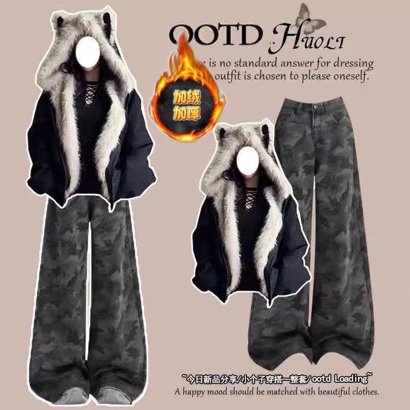 少女休闲时尚套装女初高中学生加绒外套学院风加厚阔腿裤两件套冬