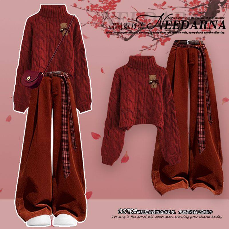 高领学生款灰色毛衣套装女2025秋冬季新款宽松上衣+黑色阔腿裤潮