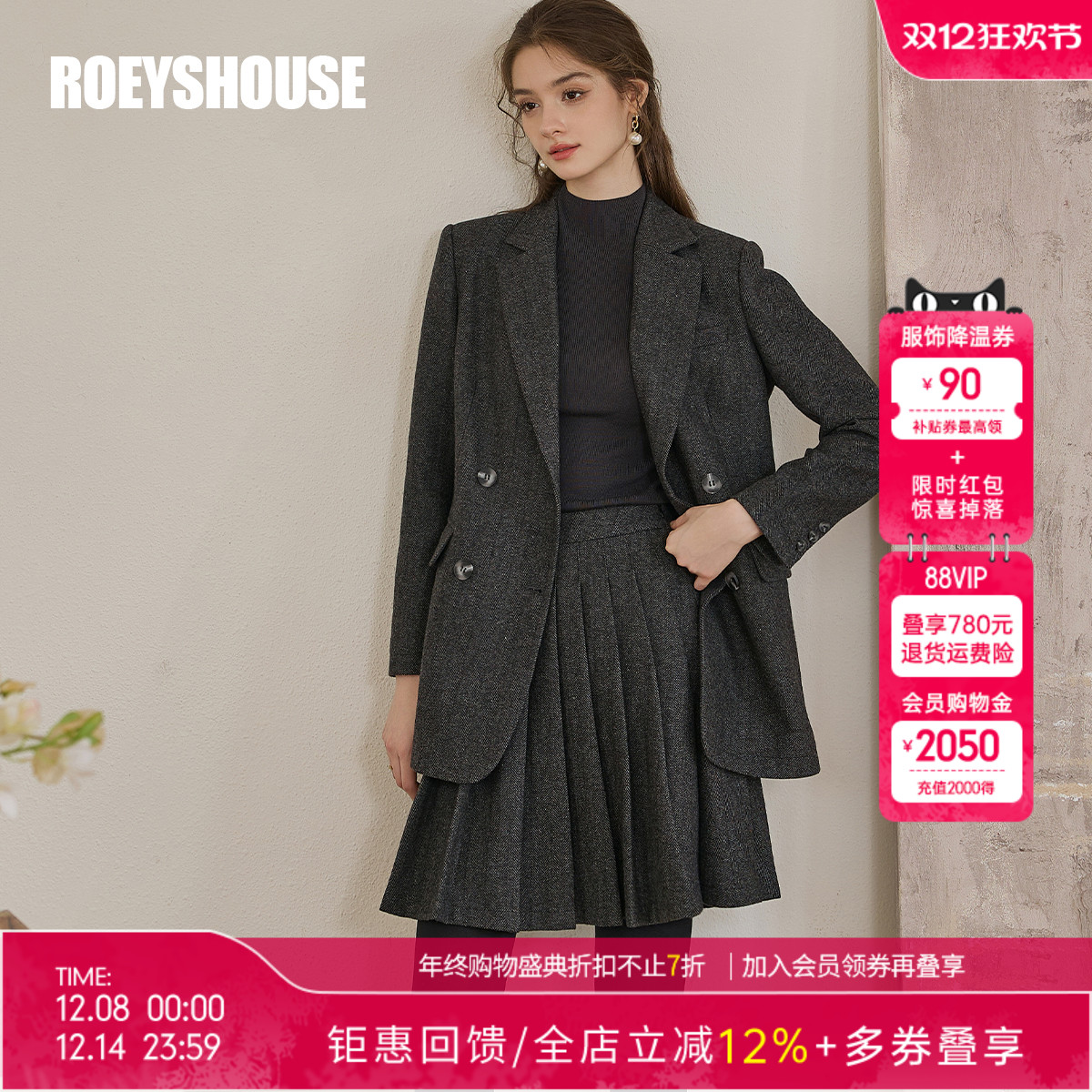 罗衣灰色人字纹两件套毛呢西装外套+百褶裙套装套裙减龄显瘦11388