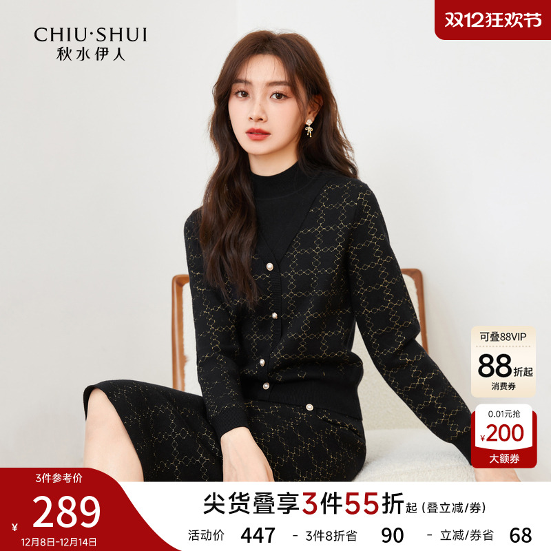 法式小香风套装女秋冬时尚单排扣V领针织衫毛衣+细闪半身裙两件套