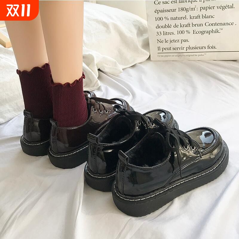 英伦风小皮鞋女平底漆皮休闲鞋春秋季韩版学院风百搭复古系带单鞋