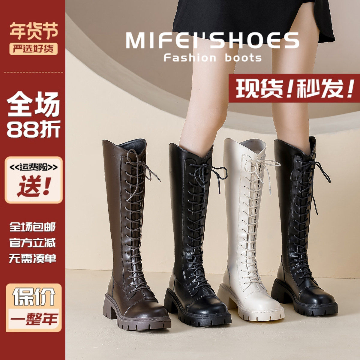 2025年新款女秋冬美拉德风厚底增高绑带后拉链骑士靴女英伦风长靴