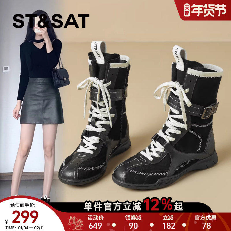 星期六真皮拳击鞋女美拉德绑带高帮马丁靴复古短靴英伦风棕色靴子