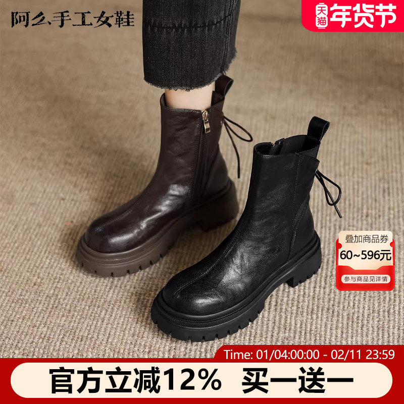 阿么手工女鞋新款拼接后绑带牛皮厚底短靴秋冬粗跟圆头百搭靴子女