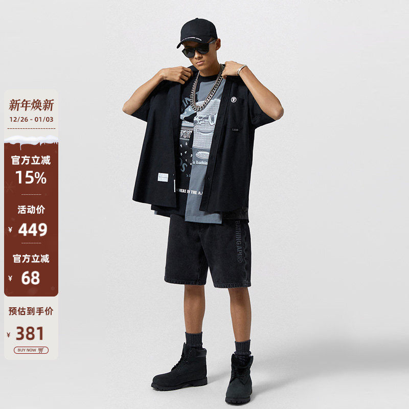 Aape男装春夏字母猿人X-BONE图案刺绣磨白牛仔短裤6731XXG