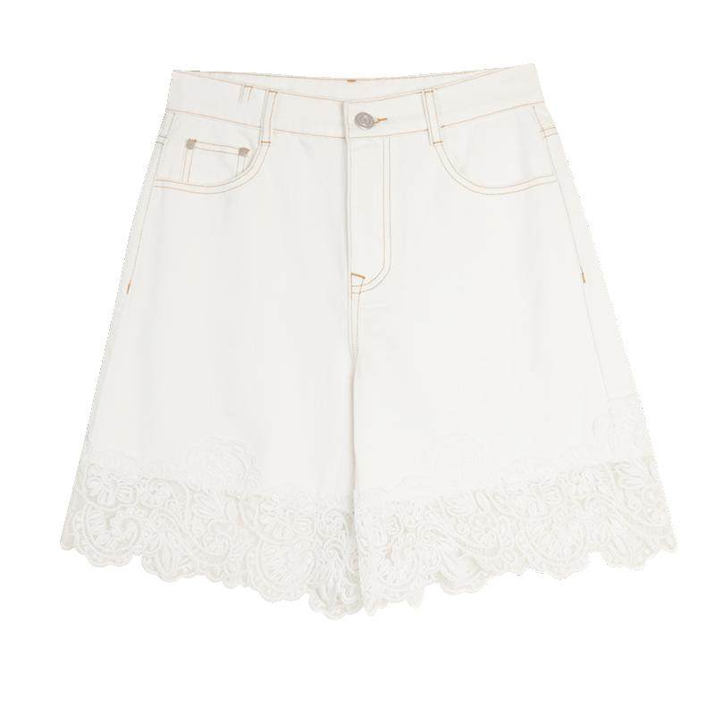 ELLE白色蕾丝花边拼接牛仔短裤女2025夏季新款高级感时尚阔腿裤子