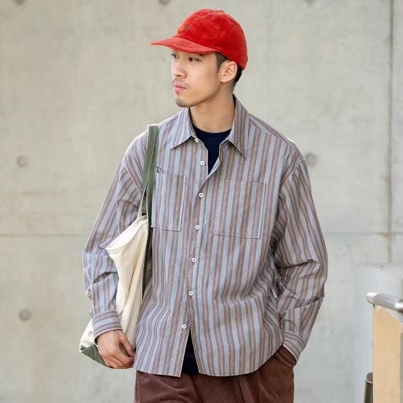 日本代购潮牌殷桃同款复古蓝色条纹衬衫外套女宽松休闲中长款上衣